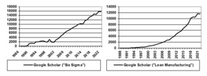 The curves in Figure 6 are similar to those of TQM in the sense that there is no indication of having reached a period of decline. In the case of Six Sigma, which was introduced publicly in 1986, there is a period of latency and rapid surge before reaching a plateau of popularity between 1992 and 2002, but then, as was also the case with TQM, the expected period of decline is replaced by extreme growth that seems to continue even today. In the case of Lean Manufacturing, the curve looks like exponential growth from 1988 and onwards, although acceleration appears to have flattened out in the most recent years. Nevertheless, linear regression indicates a growth in research interest of 689 publications per year for Lean Manufacturing, which is slightly higher than the growth of 592 publications per year for Six Sigma.