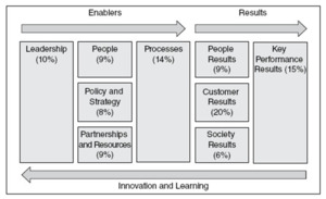 Like other regional models, the EFQM model serves an important purpose in providing an operational definition of what TQM means in a regional context, which in this case is the European context. As seen from the diagram, the model originally distinguished between enablers and results, where organisational results were evaluated against four criteria; customer satisfaction, employee satisfaction, impacts on society and business results. The percentage values associated with the different criteria illustrate the different weights they are given when the TQM maturity of organisation is assessed on a scale from 0 to 1000.