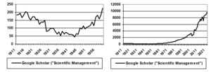 The diagram on the left shows how Scientific Management was popular until the time of the First World War, then experienced a slow decline until the end of the Second World War, and then moved into a second period of increasing scholarly interest. The diagram on the right shows how the period of popular surge has continued until the present day. When using regression analysis based on the seven last observations, the current rate of growth is 303 publications per year.