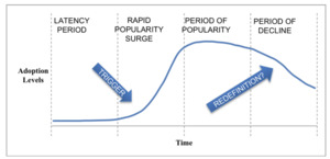 Nevertheless, in order to better understand the cycles of management fashions, Abrahamson and Fairchild (1999) focused on Quality Circles (QCs), which was a more short-lived fashion just before TQM took off, making it easier to analyse because it was a fashion that had come and gone while TQM had not ended its cycle yet. Contrary to how they initially thought that fashions were symmetrically bell-shaped in the sense of something that became rapidly popular and vanished with equal speed, they noticed from QCs an asymmetric pattern of four stages; first a latency period, then a rapid popularity surge, then a period of popularity and finally a period of decline, as illustrated in Figure 1.