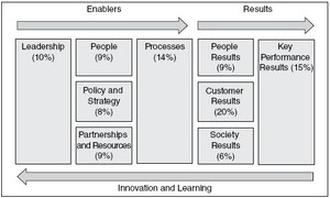 Figure 1 also illustrates how the EFQM model emphasises employee satisfaction (9%) and society results (6%). This accommodates the idea of using Critical Systems Thinking (CST) as an ideological basis for TQM, or as Flood (1993, p. xiii) puts it:
